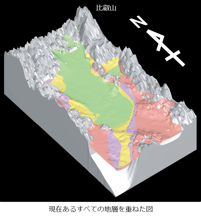 下図の例は京都盆地の3次元地質構造を表現したものです。盆地の骨格を形成する基盤岩面や基準となる地表面などの構造を地形面とあわせて立体的に示しています。